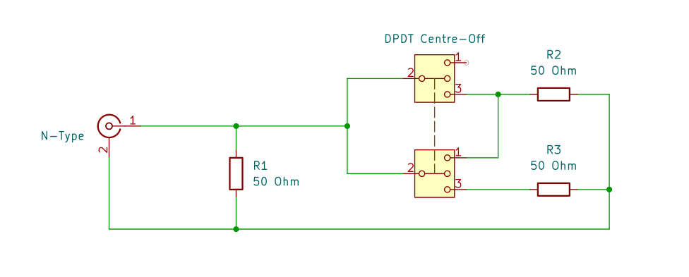 The first 50 Ohm resistor and the input from the N-type are wired to the centre of the DPDT centre-off toggle. Here is a schematic to help you wire your own: